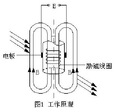 傳感器實際上是一種液體流速測量儀表。它是應用法拉第感應定律的原理制成的流速測量儀表。圖1 是插入型流量計基本工作原理的示意圖。用一個長桿將一個小的電磁流量傳感器插入到被測量管道中規(guī)定的位置,導電流體垂直流過傳感器的工作磁場時(轉換器向傳感器提供勵磁電流時,在勵磁線圈構成的勵磁系統(tǒng)中便產(chǎn)生工作磁場),相當于導體在磁場中作切割磁力線運動。根據(jù)法拉第感應定律可知,在導體的兩端產(chǎn)生感應電動勢。此感應電動勢由接觸流體的一對電極來檢測。